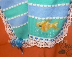 Описание: Красивый и яркий плед из шерсти связан гладью и украшен кружевом. Вышивка Золотая рыбка, словно плывущая по волнам и пускающая пузыри воздуха исполнит Ваше желание.