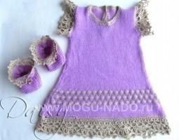 В комплекте идут пинетки, они тоже кружевные. Благодаря платочной вязке пинетка плотно садится на ножку.Узор на платье имеет рельеф. То есть он не просто плоский, а слегка вздутый шарик. Отделка по низу кружевом придает законченный вид модели.