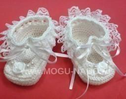 Описание: Ажурные беленькие туфельки в виде балеточек для ответственного дня крещения. Подойдут к любому крестильному платью или рубашечке.