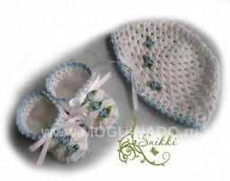 Описание: Комплектик связан из 100% хлопка, размер садалей по подошве 9,5 см на 0-4 месяца, объем шапочки 42см, при необходимости уменьшается ленточкой