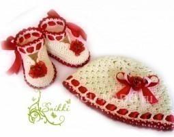 Описание: Комплект на девочку 3-6 месяцев, размер пинеток по подошве 10 см, объем шапочки 42-43 см, материал - 100% хлопок, атласная лента.