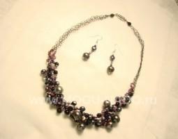 Описание: Роскошный комплект! Крупный черный жемчуг прекрасно сочетается с гранеными бусинами авантюрина черничного цвета и мелким серым жемчугом искусно соединенным с темно-розовым и синим бисером.Плетение черной проволокой придает некую загадочность и торжественность. Колье великолепно смотрится и привлекает восхищенные взоры!
