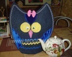 Описание: Грелка на заварник"Сова"Материал верха-драп,аппликация(фетр,велюр,ленты,репсовый бантик,глазки),внутри подкладка-флис+синтепон ,стежка