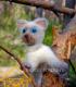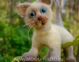Рост 20 см. Выполнен из нитки «Ангора де Люкс». Шея подвижная с двумя скосами на двух болтах, получается с одной стороны широкая, а с другой узкая. Такая конструкция подвижной шеи позволяет котику смотреть прямо и вниз, а так же делать интересные наклоны головой. Внутри кота каркас из медной проволоки в изоляции. Тонирован акриловыми красками. Наполнитель - холлофайбер