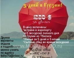 Описание: Проведите пять незабываемых дней и ночей в Тбилиси с выездными экскурсиями по стране. На Вас ждут пять экскурсий полного дня, в том числе винные туры. Подарки от организаторов - сувениры ручной работы на память о стране. Жилье в центре столицы с удобствами (вай-фай, ТВ, кондиционер, кухня, стиральная машина, утюг). Сытные обеды национальной кухни во время экскурсий.