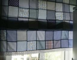 Описание: Штора выполнена из тканей геометрического и цветочного рисунка в голубых тонах, шитьё из крупных квадратов, на подкладе. Штора подъёмная. снабжена самодельным вереврчным механизмом. Размер 160х160 см.