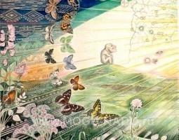 Степной пейзаж с изображением архиологических находок древних ариев и характерными видами животного и растительного мира.
