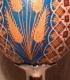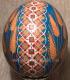 Славянская писанка на страусовом яйце (соответственно: скорлупа страусового яйца, анилиновый краситель, покрыто лаком, поставляется с никелированной подставкой в виде металического цветка.)
