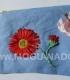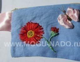 Описание: Косметичка размером 20*15 см с вышитой атласными лентами красной ромашкой и бабочкой вмещает всё необходимое и поднимает настроение!