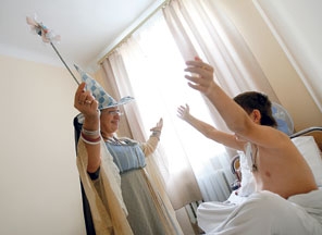 Затем юный пациент и его странная посетительница – в сказочном платье и с колпаком на голове – поют песни. А после Рива щекочет мальчика, и он заливается смехом. Это называется лекарственные смехотунчики. И тут мы забываем, что находимся в Центре детской онкогематологии и трансплантации костного мозга киевской больницы Охматдет. Когда в палату вернётся мама и спросит у сына, кто приходил, он с уверенностью ответит: фея.
