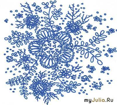 5. Поскольку нет возможности нарисовать цветы на основе, как это делается при вышивке на полотне, надо сначала наметить места расположения крупных симметричных цветов. Принцип вышивки таков: от крупных деталей к мелким. Сначала располагаем крупные цветы, оформляем их листьями, далее идут мелкие цветки, веточки, листья.