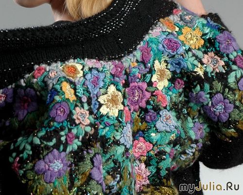 Шел девяносто третий год, кто помнит, жили трудно, дергано, легче было перечислить, то, что было на прилавках магазинов, чем, то, что отсутствовало на них. В это время я научилась вышивать гладью (за тридцатник лет было – пора бы уж и научиться!). Вышивала я, как китайцы едят, а именно - все что под руку попадется. Недавно смотрела домашнее видео тех лет, сама удивилась. Вся семья помечена вышивкой - рубашки у мужа и сына с вышитой монограммой, дочкин плащик весь в бабочках, сама вся вышитая. Дальше – больше… Как-то случайно (…а может не случайно) увидела в журнале Мод фото вязаных костюмов (белого и черного) с произвольной вышивкой по трикотажу, описания работ не было.