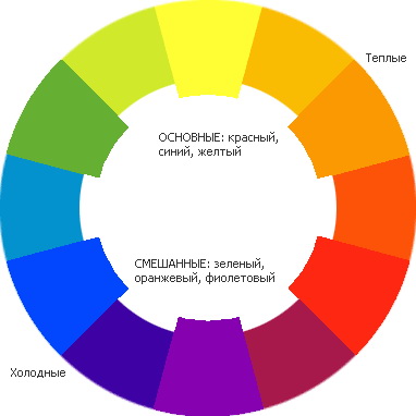 Основными принято считать 4 чистых цвета: желтый, красный, синий, зеленый. Все остальные рассматриваются как промежуточные (желто-красный, желто-зеленый, зелено-синий, сине-красный).
