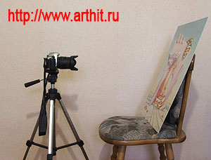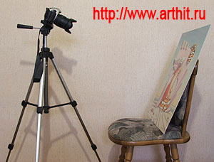 Съемку луч??е всего проводить при дневном свете, т.к. обычные лампы освещения дают желтый оттенок. Поэтому, луч??е вынесите картины на улицу (подойдет балкон или лоджия). Но учтите, что на балконе (или лоджии) освещение неравномерное, и свет обычно идет с одной стороны. Поэтому желательно поставить сбоку от картины боль??ой чистый лист бумаги (ватман). Свет с улицы отразится от него и создаст дополнительное освещение для картины. В итоге общее освещение будет более равномерное.