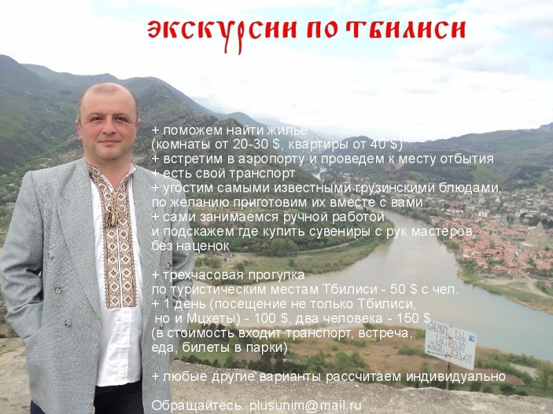 Cемейная пара из Грузии проведет до трех (включительно) человек по Тбилиси, Мцхета. 3 часа - 50 $ с человека (только Тбилиси, просто прогулка знаковыми туристическими местами) 1 день (Тбилиси, Мцхета) - 100 $, два человека - 170 $ три человека - 240 $ . В цену входят расходы на бензин, угощенье, некоторые входные билеты (например в этнографический музей под открытым небом). Другие варианты (больше дней, другие места) - рассчитываем индивидуально. У нас нет присущей проф. экскурсоводам спешки и перенасыщености историческими фактами и датами, мы проводим с вами время по семейному, неспеша, рассказывая все просто и доходчиво, как люди любящие свою страну. Язык общения - русский и украинский. Отдых с нами больше всего подойдет людям, желающим спокойно и приятно осмотреть город, угостится грузинской кухней, а также ценителям ручной работы (так как мы ею занимаемся)