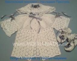 Описание: Идея крестильного комплекта - семейные традиции и семейные реликвии. Этот комплект любого новорожденнго превратит в маленького наследника престола. Великолепные узоры, мягкий хлопок и тонкое вязание крючком, превратит семейное торжество в настоящую сказку.