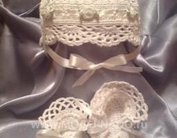 Описание: Крестильный комплект в английском стиле, чепчик и пинетки-туфельки.