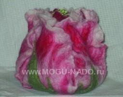 Описание: Сумочка в виде бутона розы, изготовлена в технике мокрого валяния. Ручка - атласная ленточка, сплетенная в косичку.