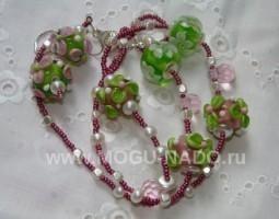 Описание: Оригинальной формы, милые бусы и чудесные сережки.Светлые, прозрачной зелени бусины с белыми цветами внутри и объемные цветочки на розовых бусинах ассоциируются с весной,ароматом ранних цветов и чистым воздухом...И волшебством!