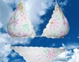 Описание: в белом вязаном купальнике, расшитом бисером и стеклярусом, вы станете королевой пляжа!