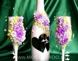 Описание: Свадебные бокалы и бутылка украшенная лепными цветами из пластики , роспись витражными красками.