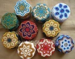Описание: Оригинальная упаковка для вашего подарка. Шкатулочка из бисера. Диаметр 4 см, высота 3,5 см.